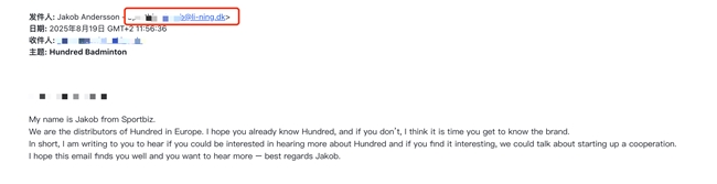 域名丑闻:在欧洲,销售代表竟然堂而皇之地使用 @lining.dk的官方域名邮箱,去开发Hundred的经销商!他们吃着李宁的饭,砸着李宁的锅,告诉零售商:“几年内Hundred将取代李宁。”